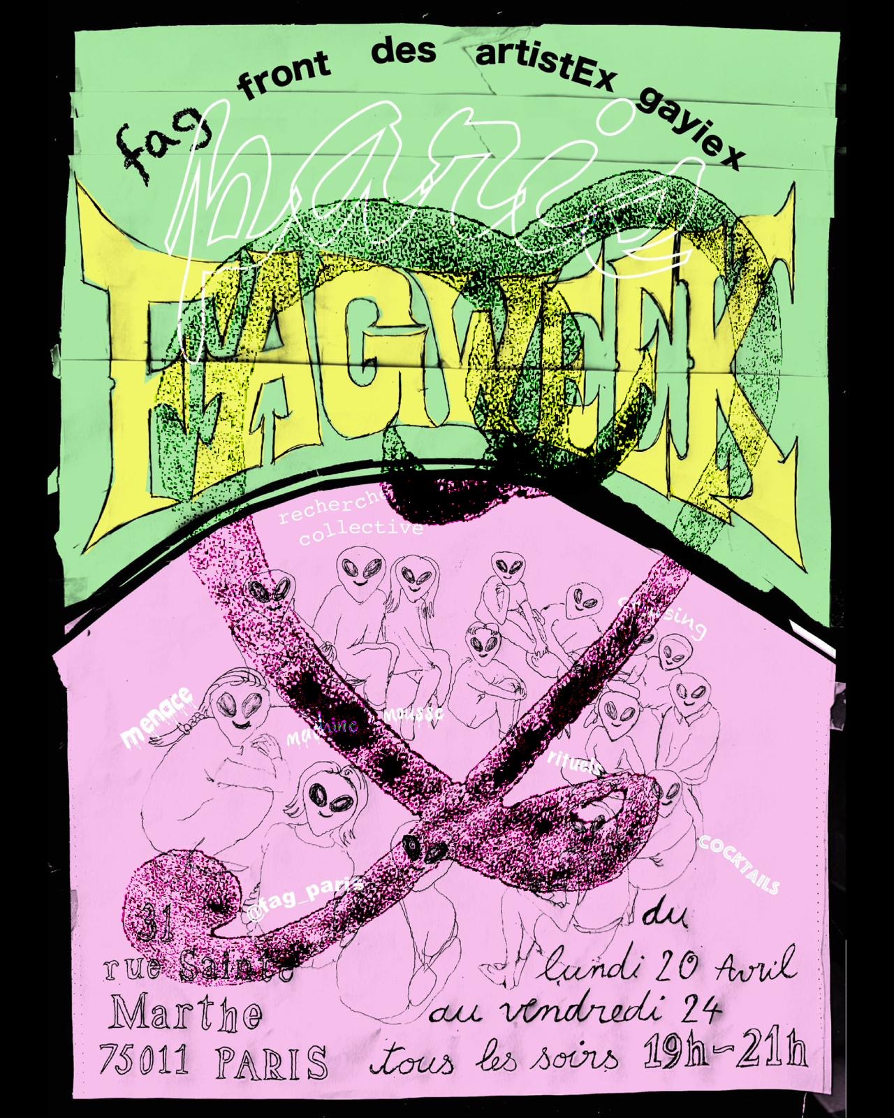 FAG front des artistEx gayiex @fag_paris frontfagparis@gmail.com đœ Programme de la Paris Fag Week #pfw Du 20 au 24 avril 2026 Au 31, la sĆur de @le29.paris 31 rue Sainte-Marthe 75010 Paris 19h~21h (les InvitĂ©Ex sont Ă venir) đœ Paris Fag Week est une permanence de cinq soirĂ©es organisĂ©e par le front des artistEx gayiex (fag). Le fag est un groupe de rencontre, une plateforme de critique collective, qui sâest initialement retrouvĂ© dans des parcs autour de cette question : âque peut-on attendre dâun collectif dâartistex gayiex aujourdâhui ?â.
